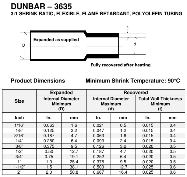 DUNBAR-3635 is a flexible, high shrink ratio, flame retardant heat shrinkable polyolefin tube. It is suitable to protect a wide variety of electrical applications, including wire splices, breakouts, and connectors-to-cable transitions.